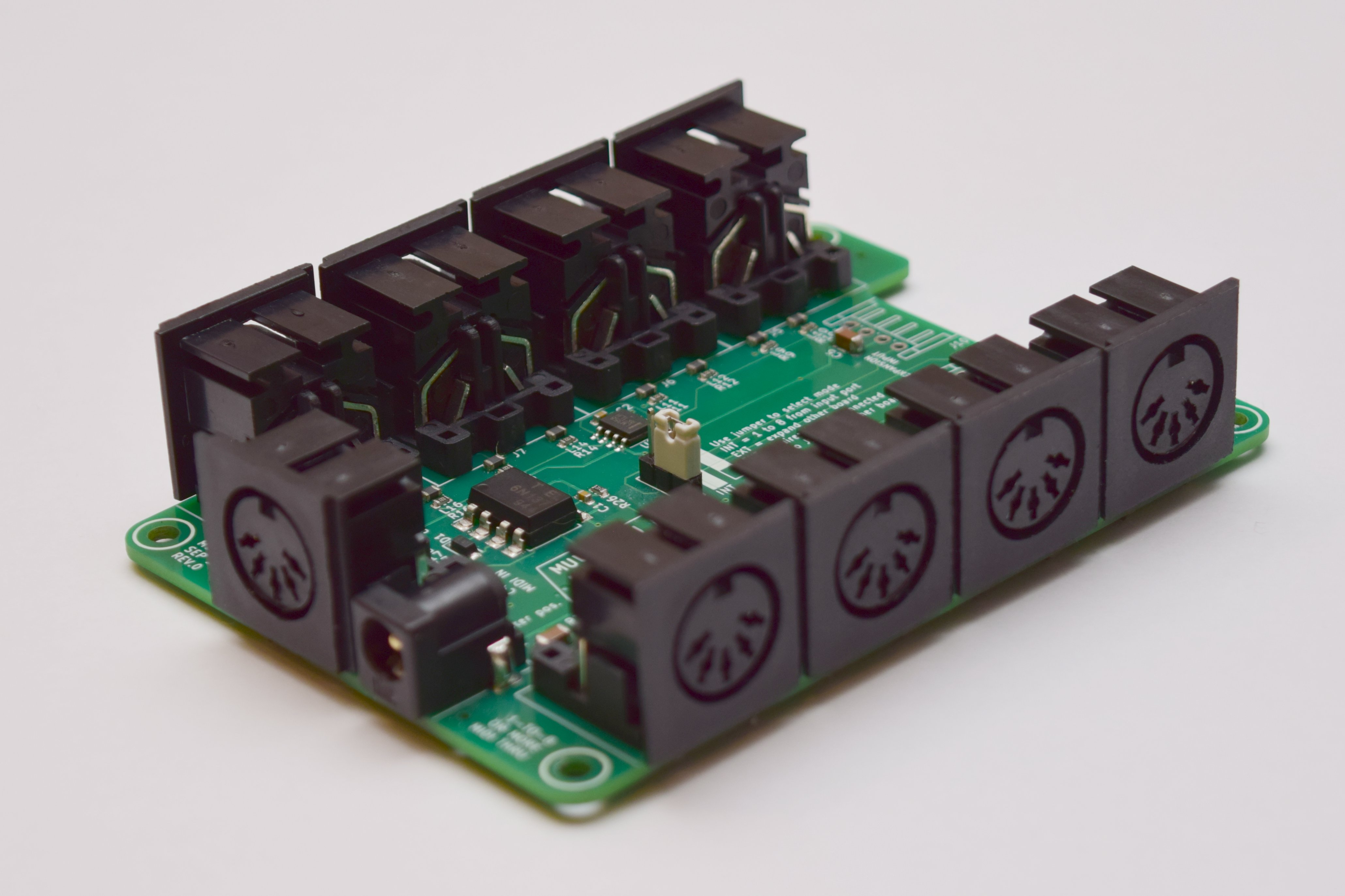 The board can be expanded by connecting to one a second unit. With the help of a jumper, it can become a 1-to-16 or more box (with further boards chained). Alternatively, two boards can share only power, making for two disctinct 1-to-8 MIDI Thrus powered from one supply.