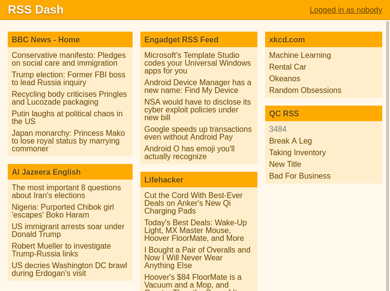iGoogle was my browser home page for years. I mainly used it to keep track of several blogs and webcomics through its handy RSS widgets. Unfortunatly Google, as they are wont to do, decided to shut it down. I didn’t want to give up my RSS feeds, so I built a replacement for the RSS widgets.
